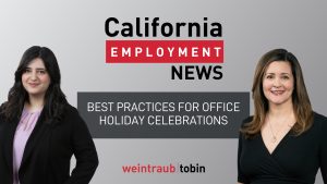 With the holiday season upon us, there are some important tips for employers to keep in mind for holiday gatherings and celebrations. Meagan Bainbridge and Nikki Mahmoudi discuss these best practices in this special edition of California Employment News.